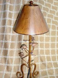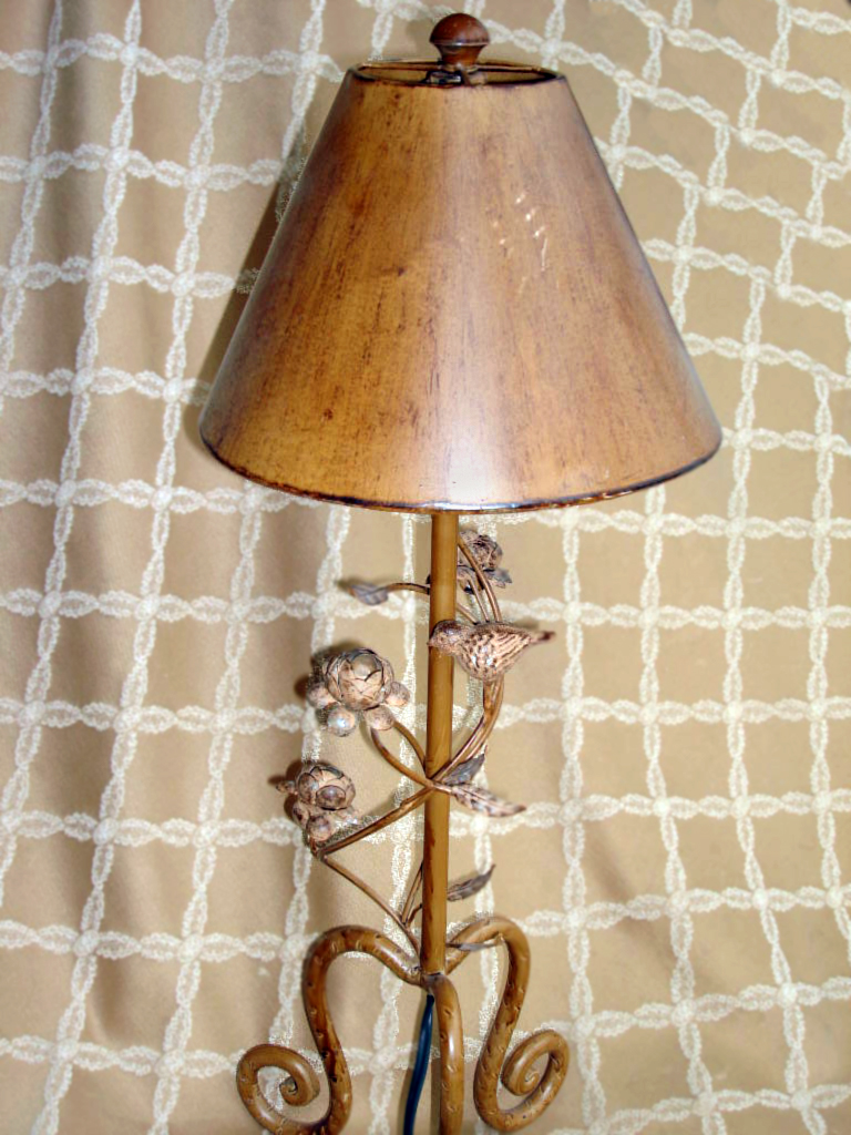 Beautiful metal and iron accent lamp with a bird and intertwined roses embellishing the base. Measures 2'9" high and the the distressed-look shade is 9" at the widest point. Great accent lamp for a garden style home. Click here to go to ebay listing.