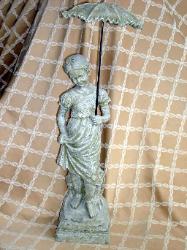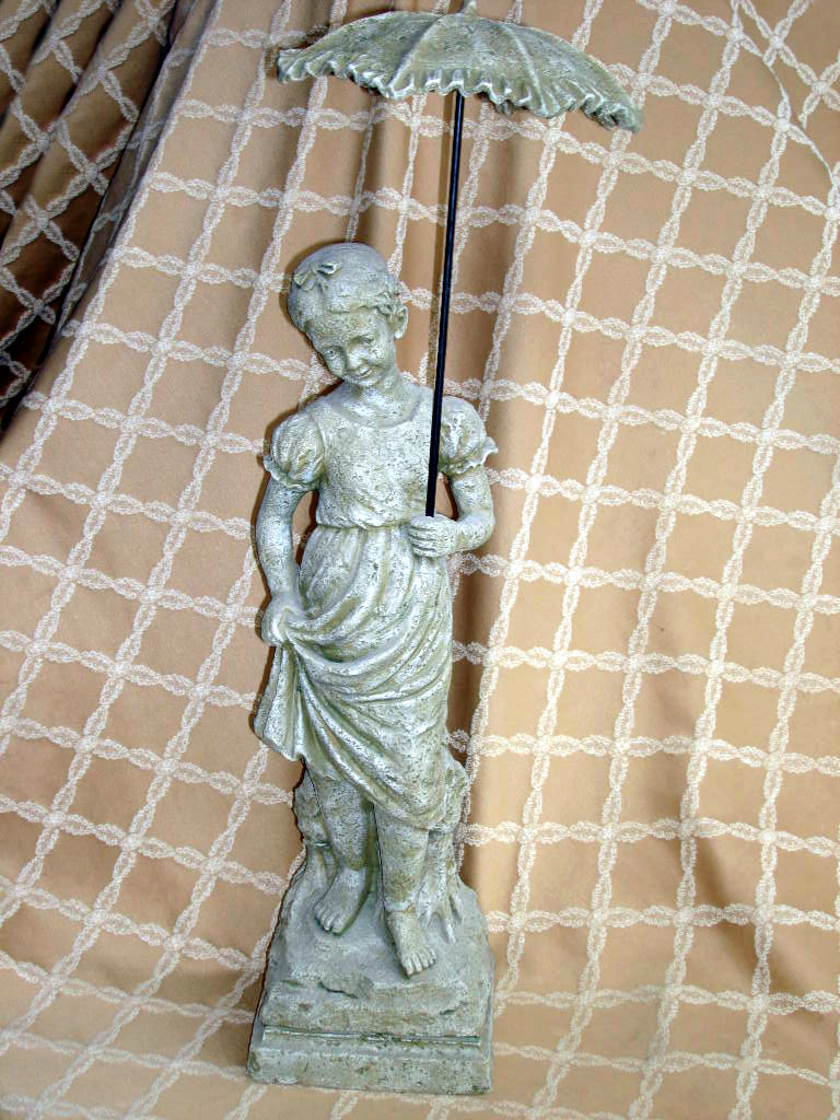 This figurine of a sweet girl holding an umbrella has Victorian garden style. Equally at home in the sun room & garden. Measures 2' 3" tall with a base of 7"x 7." Resin-like material looks like weathered stone or concrete. Click here to go to ebay listing.SOLD