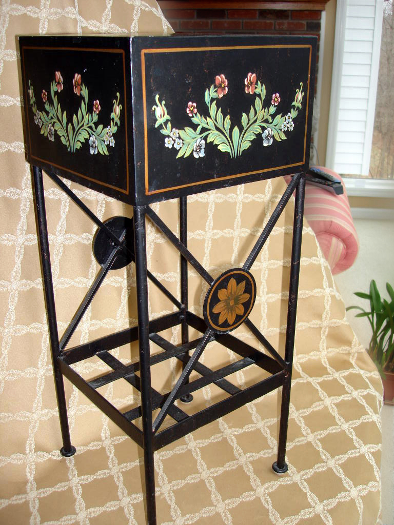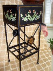 This striking little accent table measures 10w"x 10d" and 2' high. Painted in tole-like fashion, this piece would look charming in any English, French, shabby chic or garden-inspired interior. A great addition to a garden room or powder room. Painted design is the same on all four sides. Made of a very heavy metal. Click here to go to ebay listing.