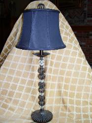 Elegant Quoizel Mfg. lamp with antique bronze finish and glass accents. Shade is black silk or silk-like material. Measures 2'9" from table to top and a base width of 9." This elegant table lamp has a unique globe-shaped finial with a hand-forged look. Click here to go to ebay listing.